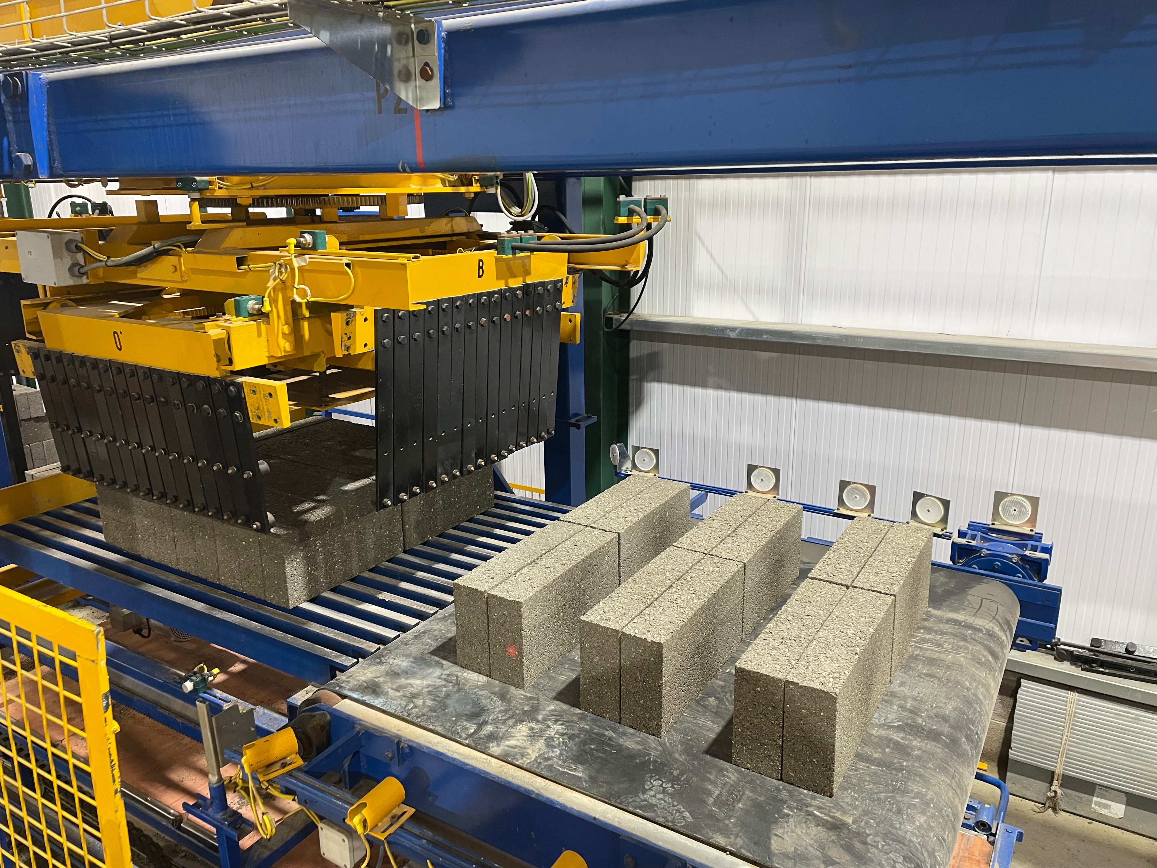 La planta utiliza una bandeja de producción de 1200 x 700 mm, con una capacidad de 9 bloques de 100 mm por ciclo. A diferencia de los sistemas con estanterías fijas, esta instalación emplea un sistema dinámico de racks (8 x 1 palets). El elevador y el descensor funcionan como cargadores de racks, integrados con un carro de transferencia totalmente automatizado que transporta los racks hacia la zona de curado.