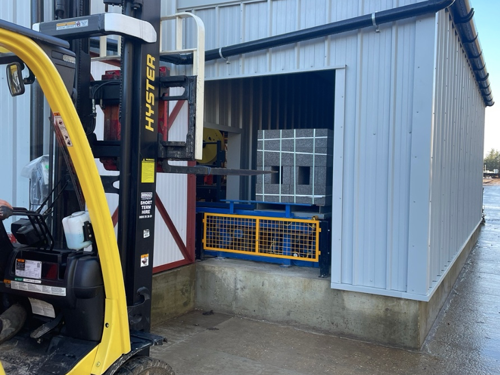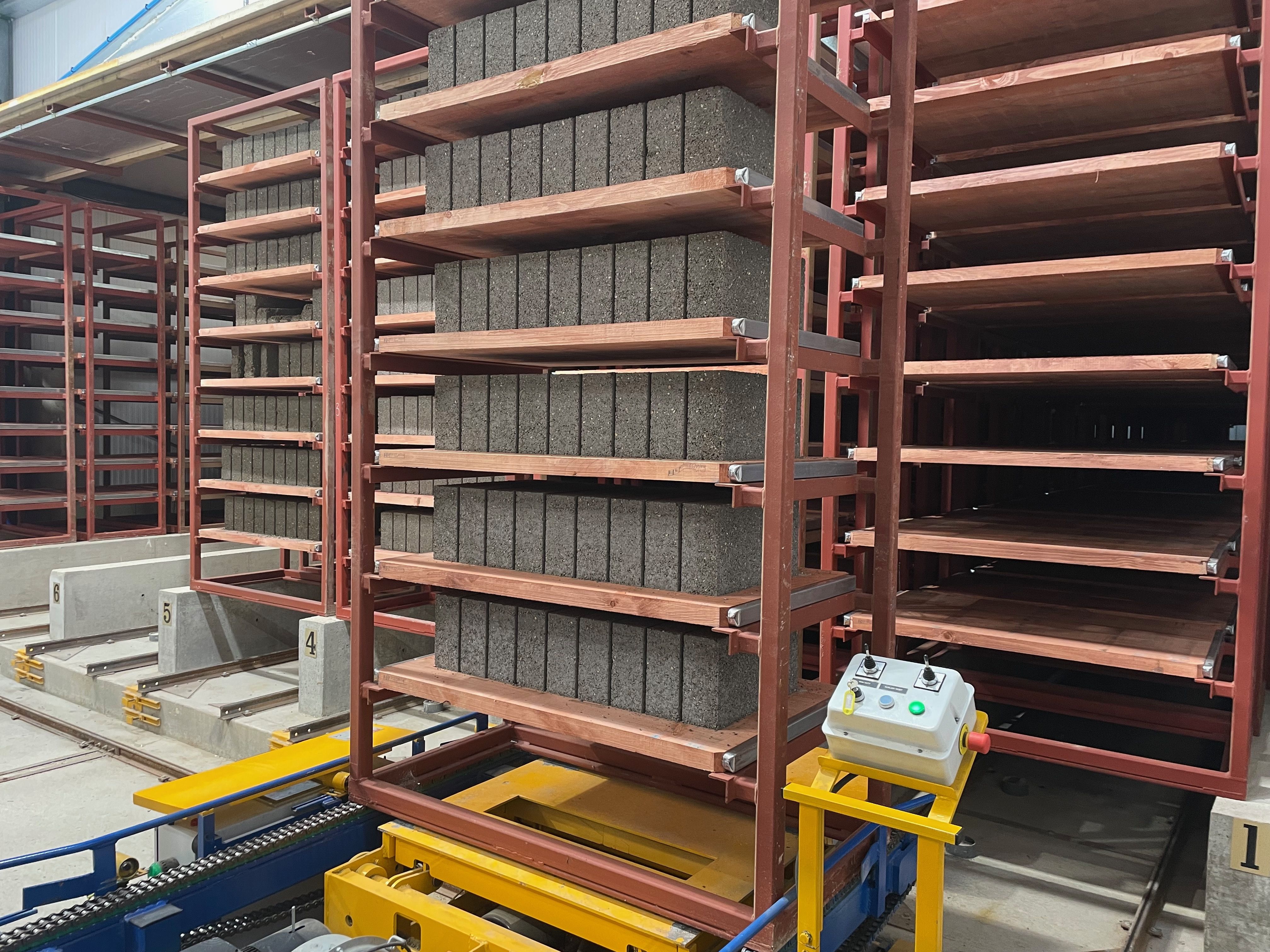 La planta utiliza una bandeja de producción de 1200 x 700 mm, con una capacidad de 9 bloques de 100 mm por ciclo. A diferencia de los sistemas con estanterías fijas, esta instalación emplea un sistema dinámico de racks (8 x 1 palets). El elevador y el descensor funcionan como cargadores de racks, integrados con un carro de transferencia totalmente automatizado que transporta los racks hacia la zona de curado.